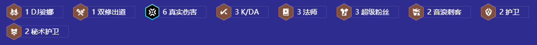 1DJ娑娜、1双修出道、6真实伤害、3K/DA、3法师、3超级粉丝、2音浪刺客、2护卫、2秘术护卫