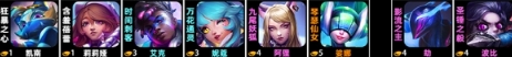 波比(EOM、舞者)、阿卡丽(真实伤害、裁决)、劫(电子舞曲、音浪)、佛耶戈(五杀、摇滚)、阿狸(KDA、法师)、奇亚娜(真实伤害、音浪刺客)