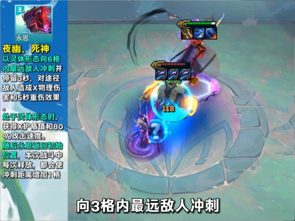 以灵魂形态冲刺到3格范围内的最远敌人面前并停留3秒,对冲刺途中的敌人造成物理伤害与持续5秒的重伤效果。处于灵魂形态时,获得2护盾与攻击速度。随后,返回初始位置。
