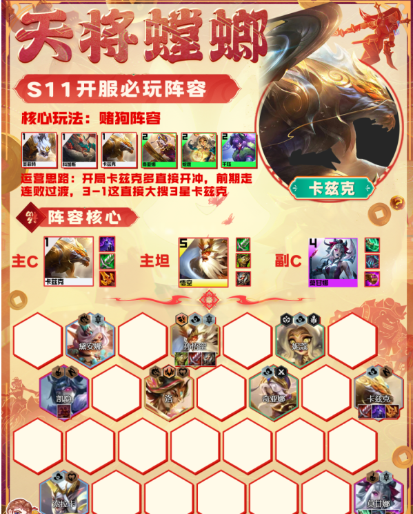 石头人不3星,后期9人口直接上孙悟空补质量,否则直接拿石头人当主坦克用。石头提供双抗增加坦度,孙悟空提供攻速加成