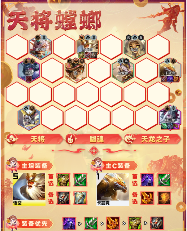 2.阵容羁绊:5/6天将2幽魂2圣贤2武仙子2死神1仙侣1齐天大圣