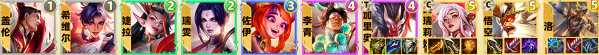 盖伦、锐雯、加里奥、猴子、李青、洛、佐伊、婕拉、希维尔、天使、刀妹