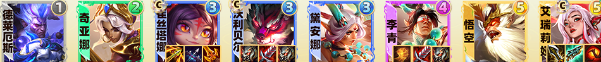 4、小炮和狗熊三星后升八人口,大D找出猴子和刀妹,刀妹替换亚索,补出猴子开出2圣贤2天将,阵容大成。