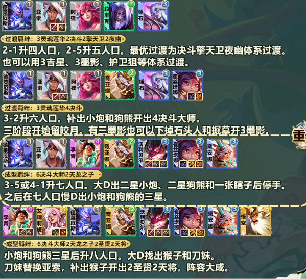1、2-1升四人口,2-5升五人口,最优过渡为决斗擎天卫夜幽体系过渡,3墨影、护卫狙等体系过渡,也可以用3吉星。