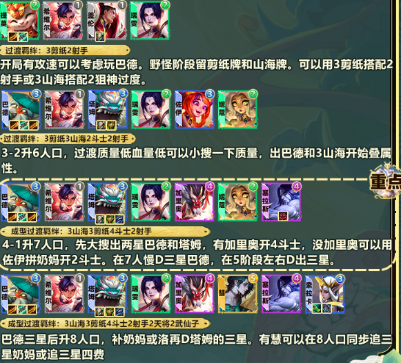 2、3-2升6人口,过渡质量低血量低可以小搜一下质量,出巴德和3山海开始叠属性。