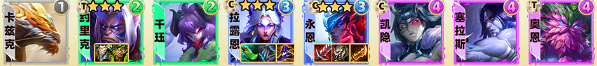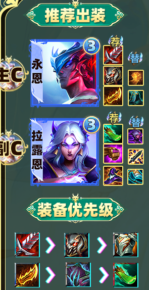 3、4-1升7人口,先大搜出公式搭配,D出两星永恩,拉露恩后停手。之后可以存钱卡50利息D,血量低于50时可以卡30利息搜,在5阶段大搜出三星永恩。
