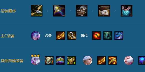 厄菲琉斯刚需一把羊刀+无尽,第三件可以根据装备选择,红BUFF>水银>其他,不需要做回复装。后期生存压力大可以通过链接瑟提获得回复。