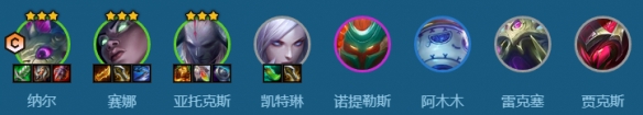 将纳尔、亚托克斯、诺提勒斯、阿木木和雷克塞放在前排吸收伤害,尽量让纳尔能尽早变形打出控制。