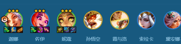 迦娜、佐伊、妮蔻、孙悟空、霞与洛、索拉卡、黛安娜、锐雯、婕拉。