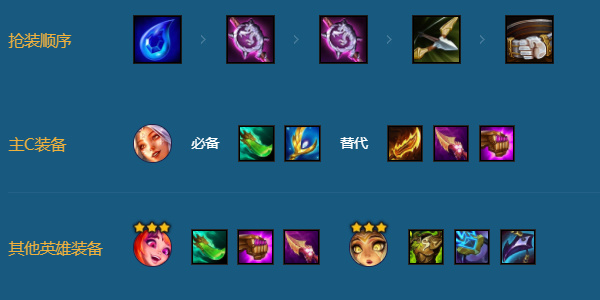 迦娜神装不变,推荐开局有水滴大棒且2阶段爆2-3张时玩,否则跑路玩别的,妮蔻全肉装;佐伊、婕拉3星可多给把青龙刀+AP装;黛安娜如果能3也给肉装。