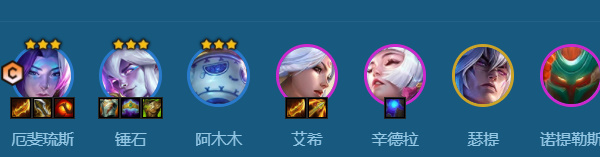 厄斐琉斯、锤石、阿木木、艾希、辛德拉、瑟提、诺提勒斯、俄洛伊、慎。