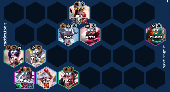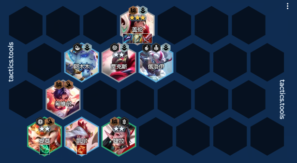 在阵容选择方面,优先搭配天将给德玛加全面属性+4护卫的开局10秒20%的减伤能让德玛更安全的叠加生命值,在斗射卡莎横行的版本,我们的后排经常会因为卡莎的弹射直接融化,正常情况下我们的等级是低于别人的,所以也很难找到刀妹开出7剪纸。