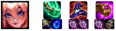 前期优先满足拉露恩的三件套,启动装和鬼书必备,虽然拉露恩有魔抗击碎,但是第一个大招吃不到破防的效果,而且也存在前面只破后排或只破前排魔抗的可能。鬼书可持续灼烧,可配合吃到其他AOE,灼烧还能触发斩杀线。