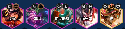 3-5拉7,如果这里前期没有如此美妙的开局导致血量有点低,在手上有2张拉露恩的前提下,可浅提升一下质量,在4阶段梭哈之前,嫖到以下任意四费卡,都可先拿来当做前排,因为夜幽没有单纯的前排,中期保证前排质量,让拉露恩来打主要斩杀,可保证血量基础