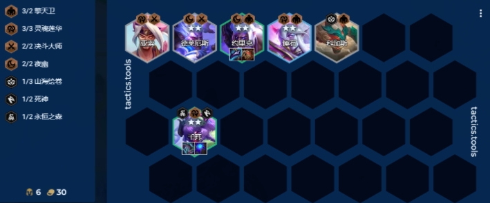 2-1拉4,2-5升5,最老生常谈的过渡开局了,没错围绕最喜欢的夜幽决斗/擎天卫+天将过渡。(如果开局法装过多的话还是比较推荐决斗夜幽莲华那套开局,法强装给狐狸消耗)