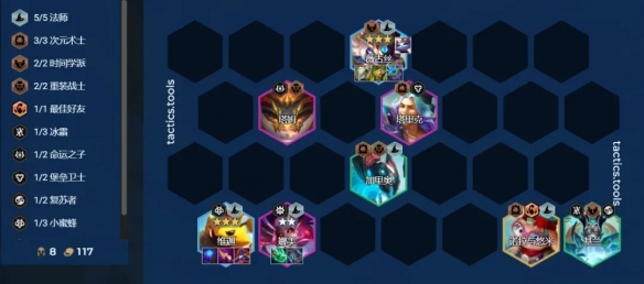 8级上能凑出羁绊的二星紫卡前排,顺便看能不能运气好D到诺拉,5张法师加时光固定的情况下,其他棋子都是锦上添花