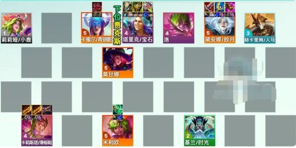先获取一把弓然后得到羊刀,然后就可以用3魔战3次元,用寒冰/佐伊主C,前期没有什么要求的,等我们到了8级之后可以用4堡垒+3魔剑+1张洛+1/2星滑板鞋,这样就有钱到9级了。