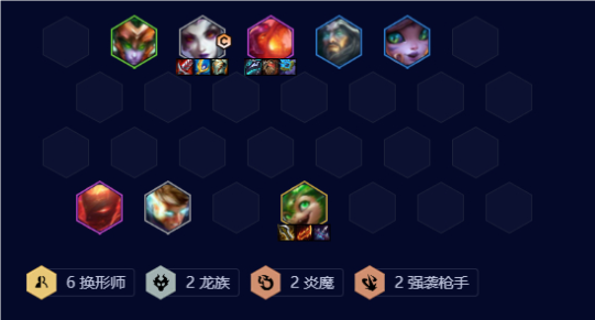 3、4-2上8开满羁绊,后期转职多可以考虑开八换形,大幅提高换形师们的血量。