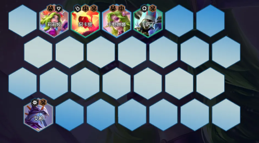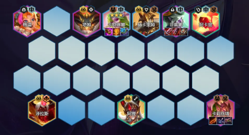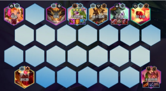 站位方面卡特前排挨打先手给重伤和AOE伤害,剑姬对位对手C位有概率秒杀对手C位,滑板鞋跟剑姬站同侧提供破甲,更快过掉对手前排,有泽拉斯命运给他!