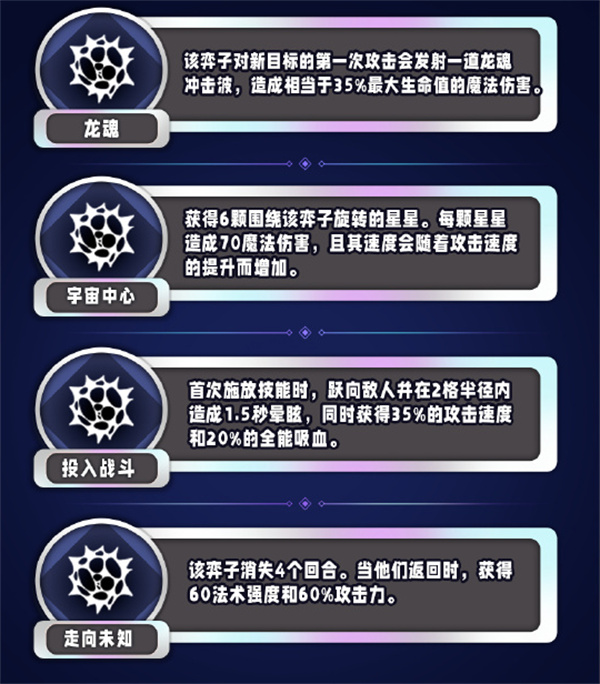 该弈子对新目标的第一次攻击会发射一道龙魂冲击波,造成相当于35%最大生命值的魔法伤害。