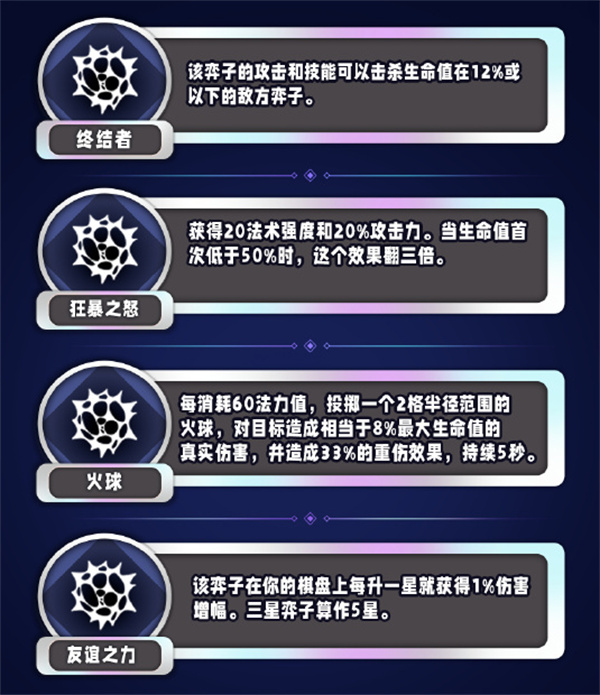 该弈子的攻击和技能可以击杀生命值在12%或以下的敌方弈子。
