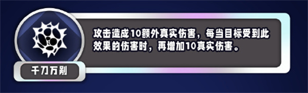 攻击造成10额外真实伤害,每当目标受到此效果的伤害时,再增加10真实伤害。
