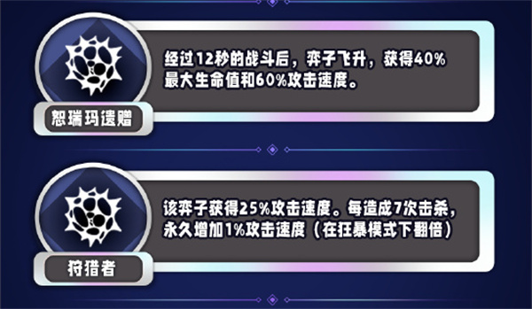该弈子获得25%攻击速度。每造成7次击杀,永久增加1%攻击速度(在狂暴模式下翻倍)