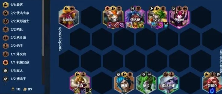 标准阵容:6极客 2伏击 2双形 2哨兵 2格斗 2炮手 1外交官 1机械公敌