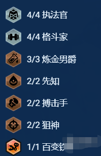 4执法官、4格斗家、3炼金男爵、2先知、2搏击手、2狙神、1百变铁手