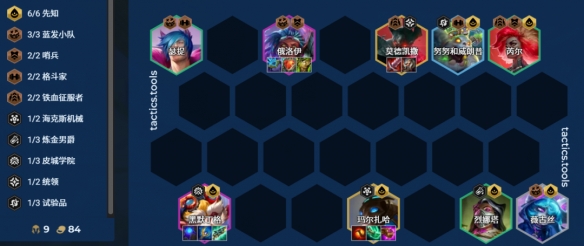 标准阵容:6先知 3蓝发 2哨兵 2格斗 2征服者