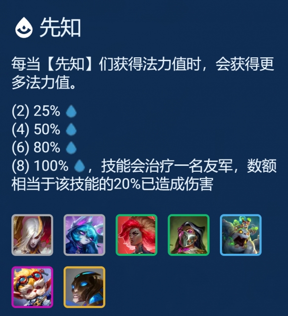 羁绊效果:每当【先知】们获得法力值时,会获得更多法力值。简单来说就是平A回更多的蓝,以及头盔等提供回蓝的装备也会获得更多的蓝量