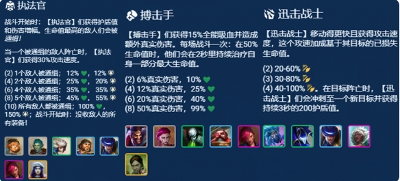 标准阵容:8执法官 2搏击手 2狙神 2迅击战士 1外交官