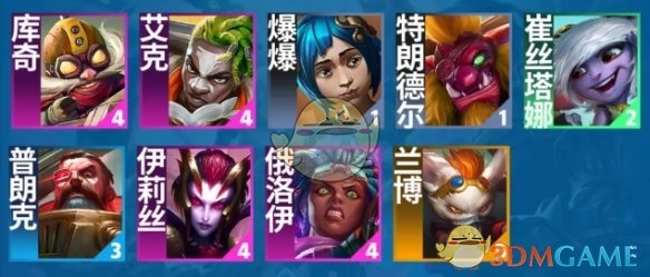 阵容由库奇艾克爆爆特朗德尔崔丝塔娜,普朗克伊莉丝俄洛伊兰博组成,核心是6极客,这几张5费如果两星可以搭配极客的羁绊灵活挂,但目前阵容核心超模的是飞机