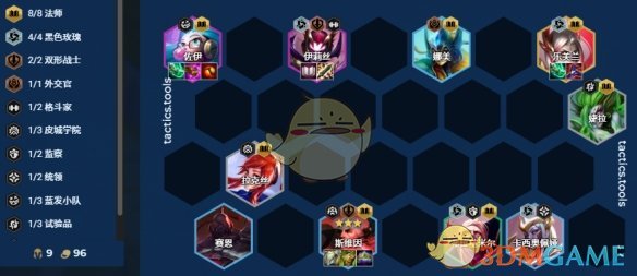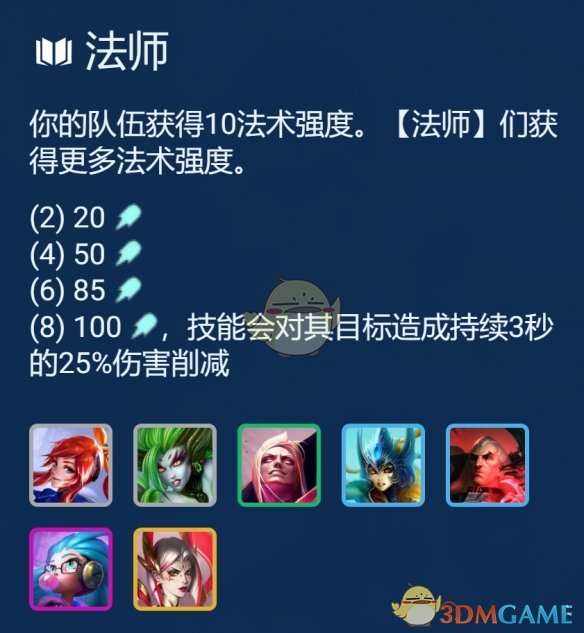 阵容强度来源于八法提供的额外效果:队伍获得10法强,法师额外获得100法强;技能会对其目标造成持续3秒的25%伤害削减