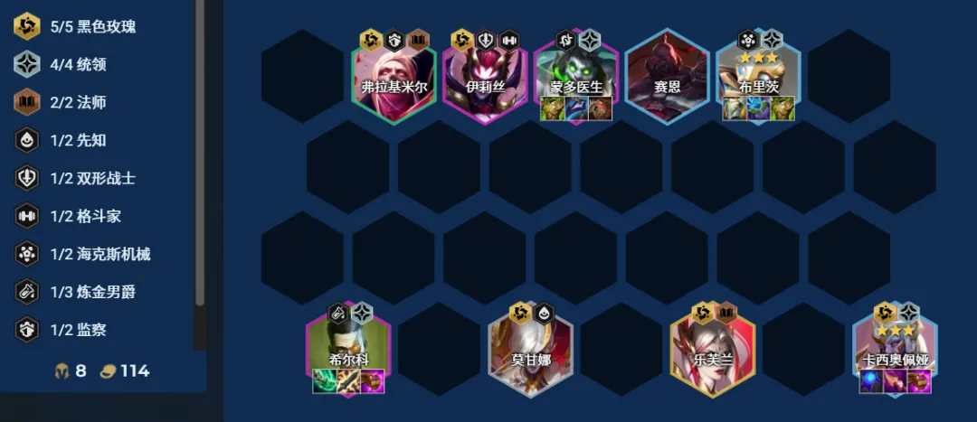 黑玫先知属于纯法系九五阵容,大后期黑默丁格、玛尔扎哈、乐芙兰3个棋子选2个充当C位,输出强度非常炸裂,前二率非常高。