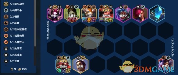 但这套阵容需要的4/5费棋子比较多,不建议在多赌狗对局中考虑,C位2星慢,输出强度会跟不上。