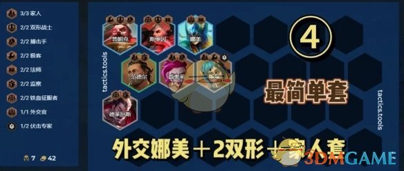 羁绊:3家人 2双形战士 2搏击手 2极客 2法师 2监察 2铁血征服者 1外交官