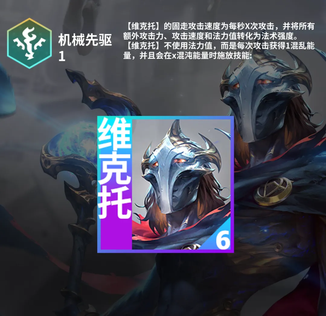 【机械先驱】:维克托的固定攻击速度为每秒C下,并将所有额外攻击力、攻击速度和法力值转化为法术强度。不使用法力值,而是每次攻击获得1混乱能量,并且会在D混沌能量时施放技能