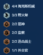 4海克斯、3野火帮、2狙神、2监察、2迅击战士、1外交官