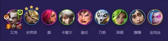 艾克、史密奇、蔚、卡蜜尔、盖伦、刀疤、泽丽、爆爆、金克丝