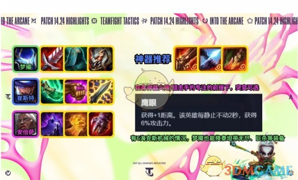 变阵2:如果早来梅尔,可以强拆洛里斯硬挂梅尔,他的强度≈4迅击的2星安蓓萨,并且放满技能还有名刀司命效果,崔斯特或阿卡丽不3的情况下,一些AP类装备都可以给梅尔(蓝量40,带红buff或者鬼书最佳,一件启动装即可),或者玛尔扎哈带