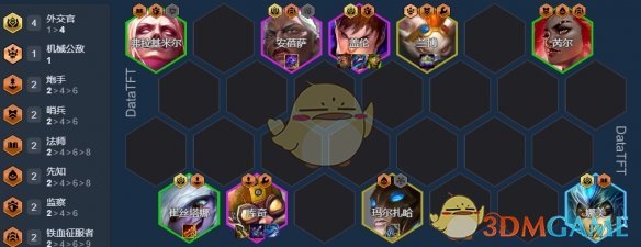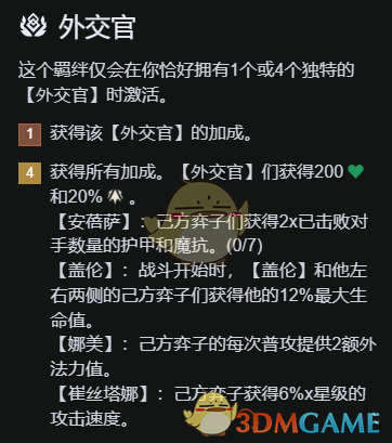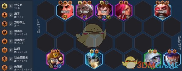 外交体系一定是最适合玩重质不重量的体系!队伍全员都能享受到安倍萨的双抗,娜美的回蓝、小炮的攻速以及德玛两侧的生命加成,且外交官还会获得额外200生命和20%伤害增幅。加上海克斯提供的12%最大生命值,每个人的基础面板都比较高!