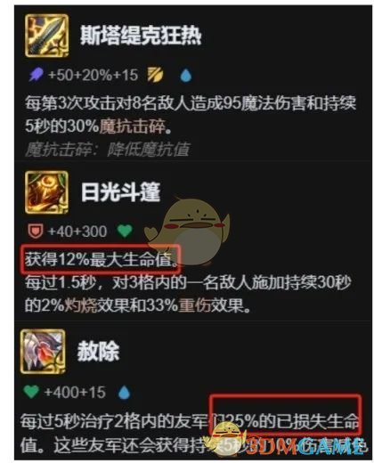 先说日炎、开局提供12%最大生命值,加上海克斯提供12%的最大生命值,随便给一个两星弈子都能打出爆炸输出,前期赢一半。其次是救赎,提供25%已损失最大生命值,搭配哨兵和格斗过渡轻轻松松打出连胜。
