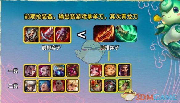 其次是通用类的装备青龙刀,它可以无脑合成。之后再根据装备的掉落情况,来考虑后续是合成物理装备还是法师装备。不过要注意的是,青龙刀一定不能给老鼠,因为老鼠没有羁绊加持,这张卡单挂的话伤害很低,就像刮痧一样,并且在没有棱彩门票的情况下,都不考虑养老鼠。