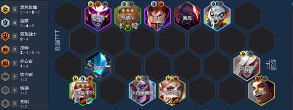 这套是用于六级追到吸血鬼和范德尔三星,外面全是德玛外交开不出外交体系,可选择黑玫监察,没德玛能换诺手,外交还能补娜美,上4黑玫也能开出4法,灵活变通包吃的!