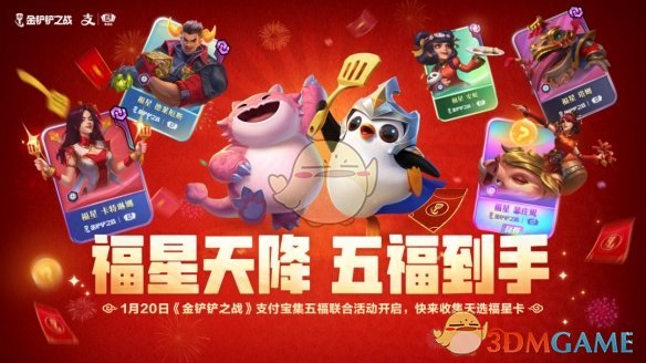 1月20日至2月2日,参与2025“支付宝集福”活动,有机会领取到《金铲铲之战》“天选福星”限定福卡