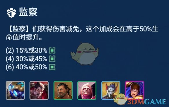 另外版本更新中监察最小伤害减免从15/25/35提升到15/30/40%,这波提升是非常大的,可极大幅度提升前排坦度,基本4监察抗伤能力就比较明显,而后期开出6监察敌方就像打铁一样。