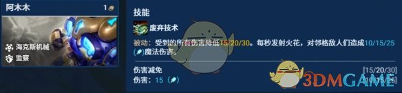 阿木木在版本更新中也增强,3星减伤数值提升到30,坦度提升较大,在4/6监察且3星情况下搭配荆刺背心与其他两件坦度装,不仅抗伤能力高,还能被动打出3000-5000的输出,这对一个1费坦来说太超模了。