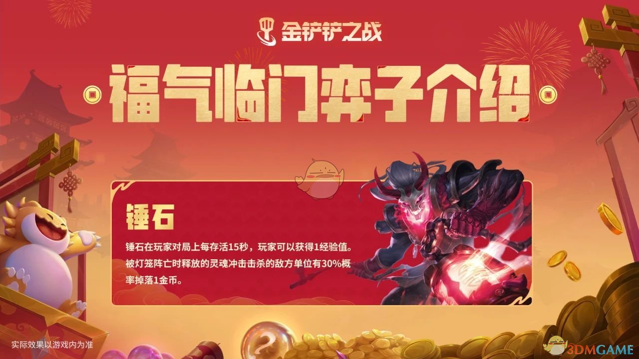 金铲铲之战恭喜发财锤石怎么样?这是一款非常有趣的游戏,玩家在游戏里需要发挥自己的策略能力,我们需要了解每一个英雄的技能,那么是不是很多游戏玩家还不了解锤石这个游戏角色的,接下来小编就为大家带来金铲铲之战恭喜发财锤石怎么样的详细介绍,希望小编的分享可以帮助到屏幕前的每一位游戏玩家,欢迎大家来阅读哦。