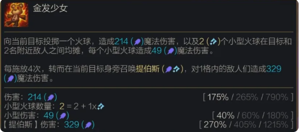 向当前目标投掷一个火球,造成(175%/265%/790%法术强度)魔法伤害,以及(2+1x增幅)个 小型火球在目标和